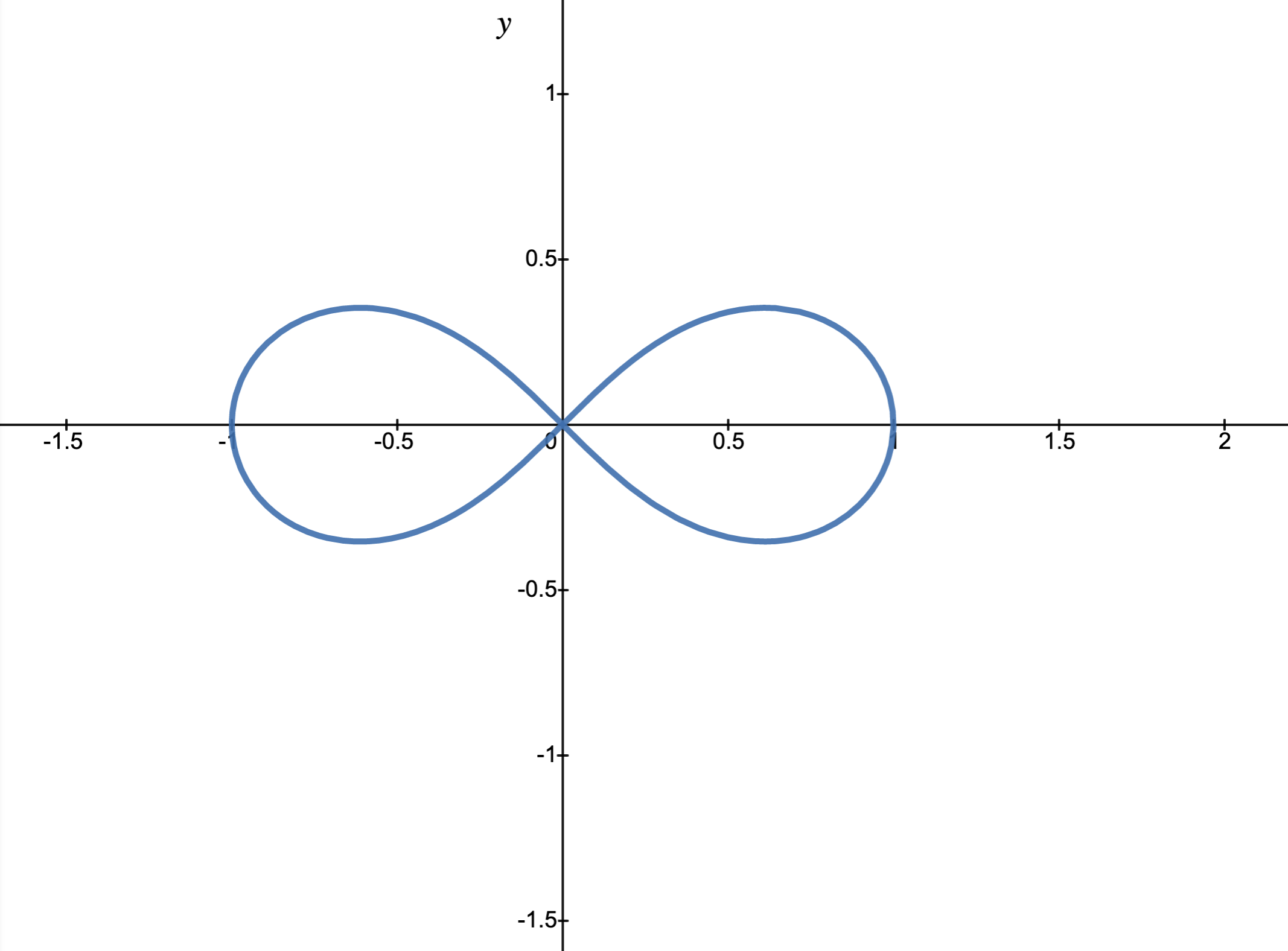 An example of a lemniscate is given in FigureĀ 51. The equation of this lemniscate is \((x^{2} + y^{2})^2 = x^2 - y^2\text{.}\) What is the derivative with respect \(x\) for this lemniscate? (Solve for \(\dfrac{dy}{dx}\)).